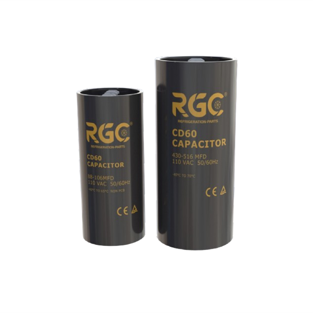 Capacitor de arranque CD60 de 110VAC, carcasa plástica resistente, ideal para aires acondicionados y motores eléctricos.